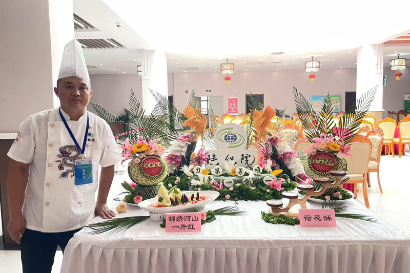 学校高度重视此次比赛,餐饮中心认真组织,精心准备,通过各餐厅推荐、校内初赛层层选拔,最终遴选出两名优秀选手代表学校参赛。大赛设置白案和红案两个赛道,从基础刀工到创意菜品设计,全方位考察选手的专业功底与创新思维。比赛现场,我校选手沉着应战、全情投入,创意菜品“锦绣山河一片红”“荷花酥”这两道作品凭借独特的构思与精湛的工艺,赢得了评委与现场嘉宾的一致好评。