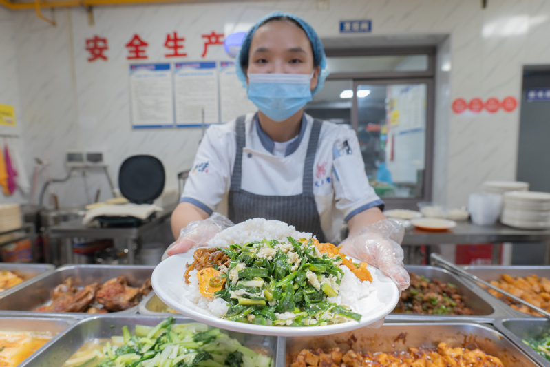 面对军训期间高强度的体能消耗,餐饮中心提前谋划、周密安排。一方面,科学制定营养食谱,注重荤素搭配与营养均衡,加强蛋白质和维生素的补充,并适当增加能量供给,确保同学们“吃得饱、吃得好、吃得健康”。各餐厅窗口均延长供餐时间,保证不同时段结束训练的同学们都能及时享用热乎可口的饭菜。