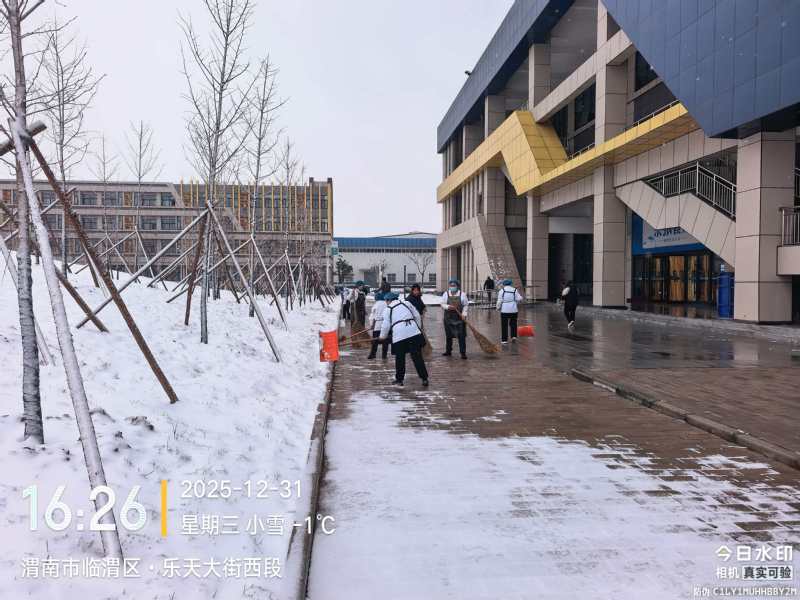 12月31日,强降雪天气突袭校园,为保障临渭、高新两校区师生就餐及员工上下班出行安全,餐饮中心迅速响应,组织两校区从业人员开展积雪清扫工作。