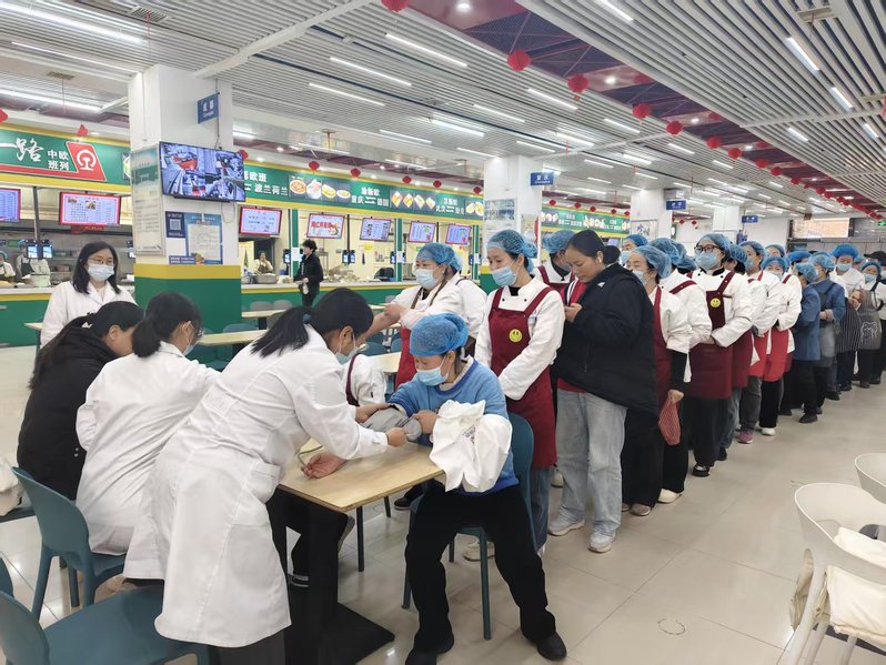当天下午,面向奋战在校园餐饮保障一线的女性从业者,后勤党总支第二党支部联合后勤党总支第一党支部,特别邀请学校医务室工作人员开展健康服务活动。现场为女员工提供免费血压测量、健康咨询等贴心服务,引导大家增强健康意识,切实守护一线劳动者的身体健康。